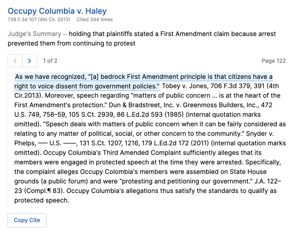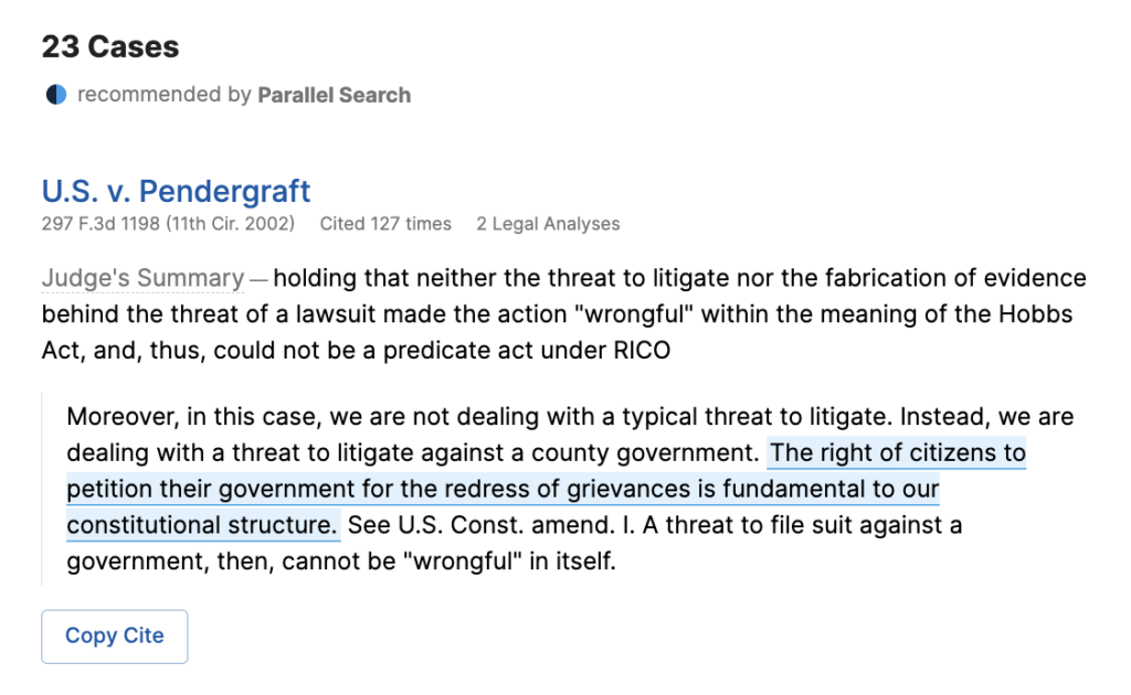 For example, an attorney can enter a proposition of law such as “The right to protest is fundamental to American democracy,” and Parallel Search returns the following in federal circuit courts:
